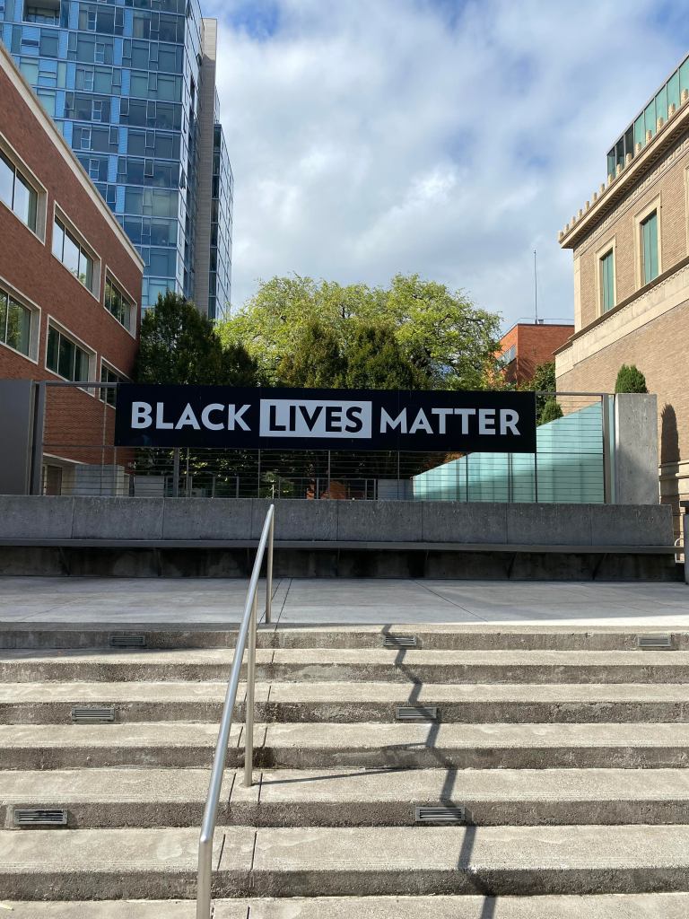 Outside, a Black Lives Matter banner hung near the entrance of the museum. This banner has been replaced numerous times because of vandalism. The ripped banners were part of the exhibit, and a fresh one still hangs outside. The message is clear; you try to tear us down, we make art from the remains and continue to stand for what we believe.