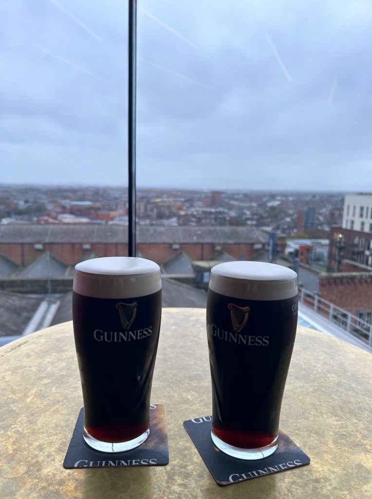 Tour of the Guinness factory. Felt like a Disney exhibit/tour. Several floors. Lots of restaurants. Top floor, two bars with windows all around. Best view of Dublin. A mix of tourists (not many Americans) and customers for holidays.
